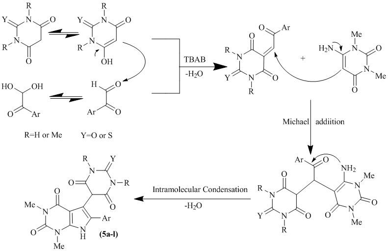 A green approach for the synthesis of polyfunctionalized pyrrolo[2,3-d]pyrimidine derivatives was successfully achieved by a one-pot, three-component reaction of arylglyoxals, 6-amino-1,3-dimethyluracil and barbituric acid derivatives in the presence of tetra-n-butylammonium bromide (TBAB) (5 mol%) as the catalyst in ethanol at 50 °C. This protocol has many advantages such as high yields (73-95%), green and simple procedure, short reaction times, easy work-up, mild reaction conditions and general applicability.